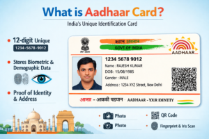 Aadhaar is a 12-digit unique identification number issued by the Unique Identification Authority of India (UIDAI). It serves as proof of identity and address and is widely used for government services, banking, subsidies, mobile SIM verification, and more.